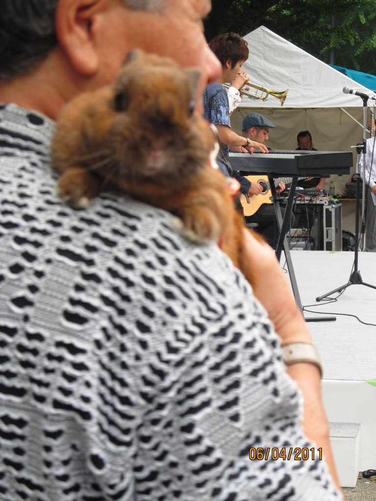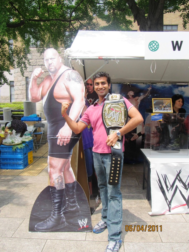 My friends Keiko and Yao happen to be cheerleaders by profession. What an amazing profession to be in! Keiko is on a very respectable position and is a part of a company which trains young cheerleaders. Keiko took us to one such festival where a team of new cheerleaders were to perform. I enjoyed watching their energetic performance and quick photo session. At the festival a few other also caught my eye, like the WWE booth which displayed the boots and the winning title of the wrestling champions ,slender ninja’s wandering in the crowd to spread awareness about saving electricity, a decorative hat and a rabbit as a pet!