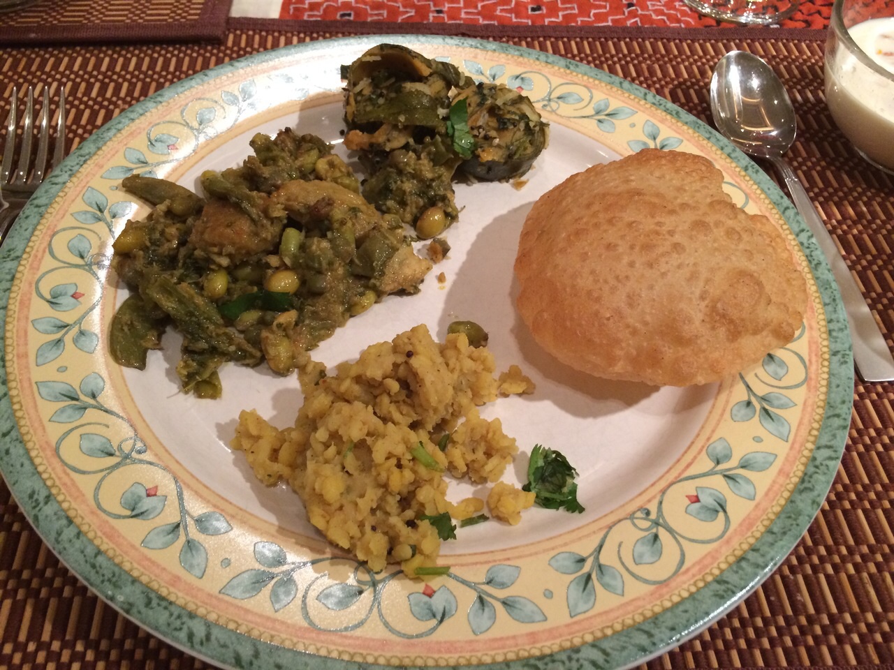 This year we had Thanksgiving dinner with Rekha aunty’s family and friends. The traditional Thanksgiving menu is non-vegetarian (stuffed turkey with mashed potatoes and cranberry sauce with pumpkin pie). But being Gujrati Jain,we had a traditional Gujrati dinner – Puri, moongdal, undhiyu, patra, orange basundi and finished up the dinner with Marie Callender’s Pumpkin Pie which was super delicious! Just a couple pics from the dinner…
