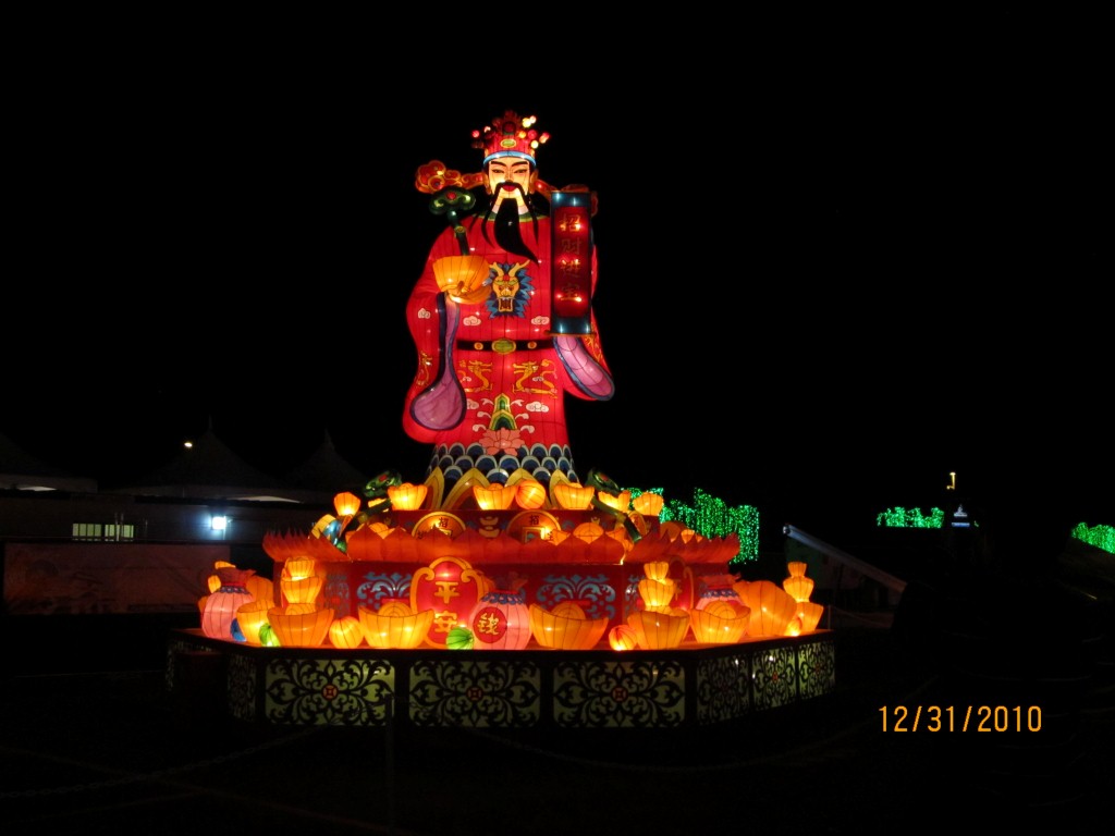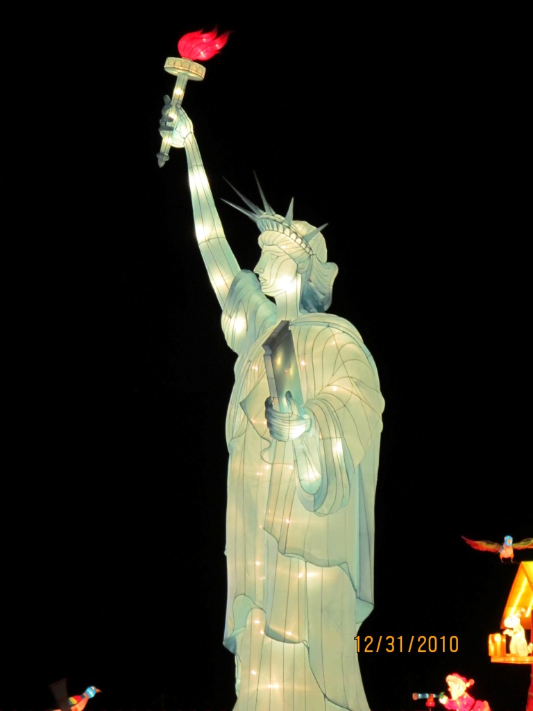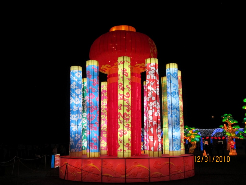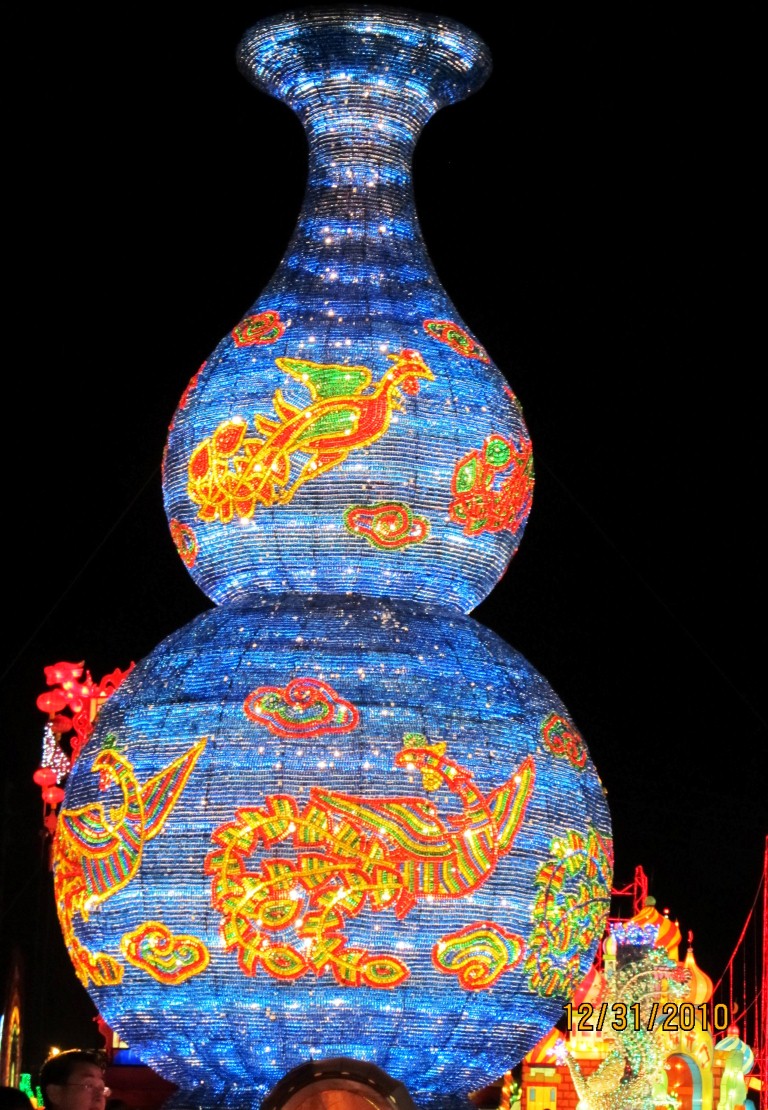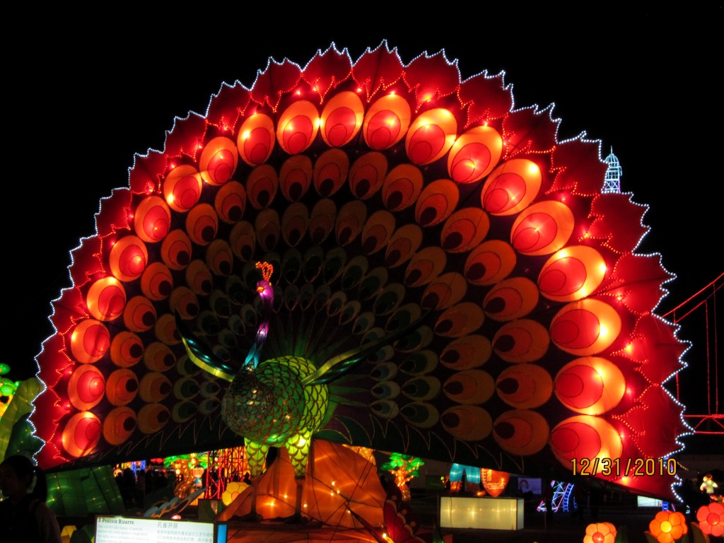 The larger-than-life illuminated lanterns were created by 4-dozen Chinese engineers and artists! These artworks were made using 20 miles of silk, 15 tons of steel and other materials including aluminium canss, bottle caps, recycled batteries, CDs, pocelain dishes, flatwares etc.